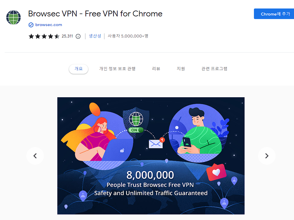 저는 크롬 확장프로그램인 browsec vpn을 사용했는데요.